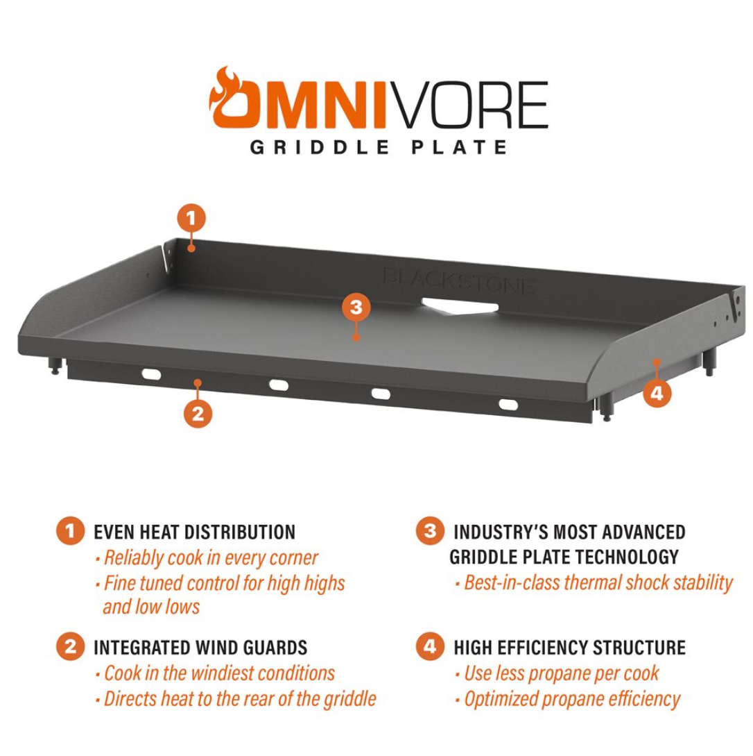 28” Omnivore Griddle Plate – Provides quicker preheat and recovery times, even heat distribution, and higher fuel efficiency. Built-in wind guards keep hot air in and cold air out.