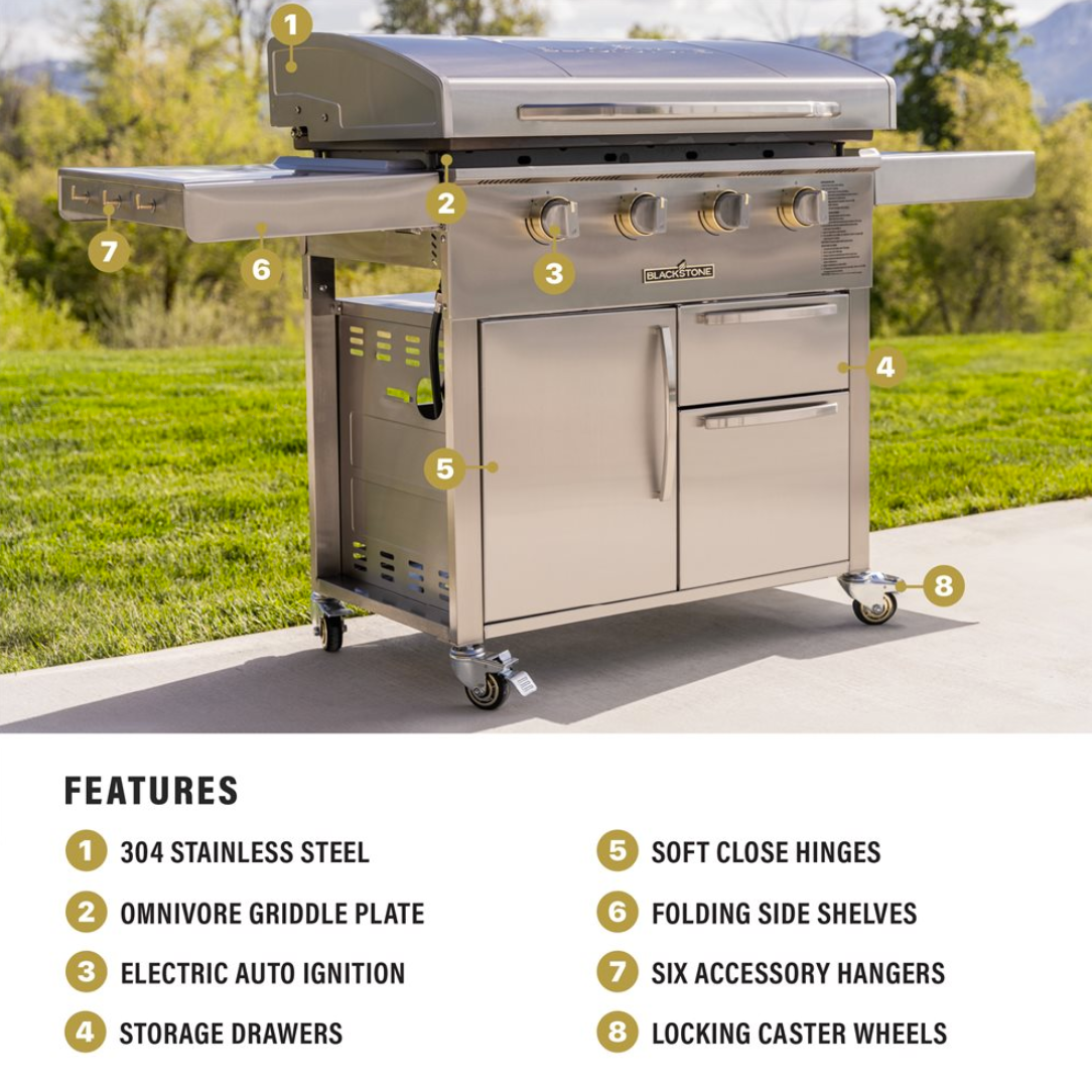 This premium Blackstone griddle combines everything you love about outdoor cooking with the durability of 304 stainless steel and the innovation of Omnivore Griddle Plate Technology. With 768 sq. in. of cooking space and four independently controlled burners, you can sear burgers, grill steaks, and prepare sides all at once—perfect for hosting a crowd.