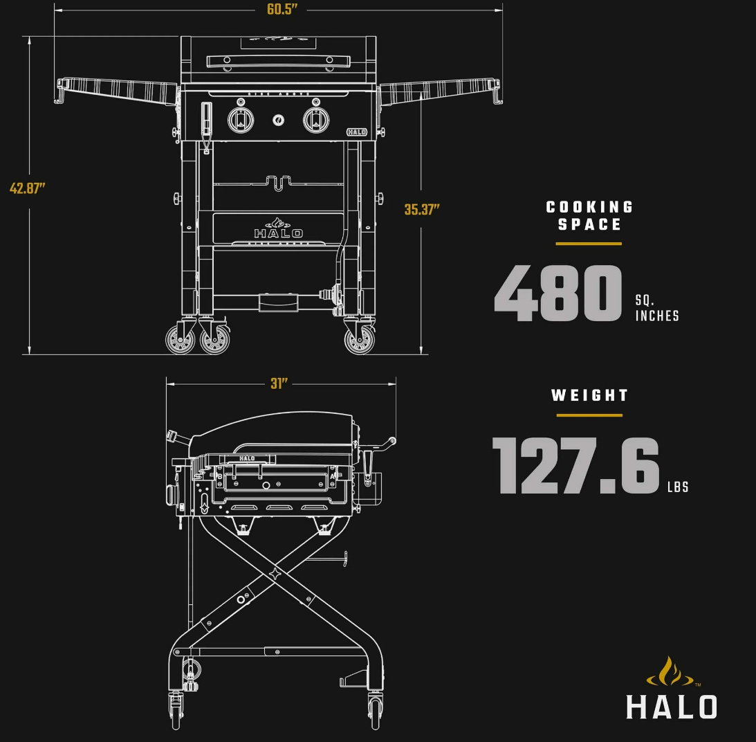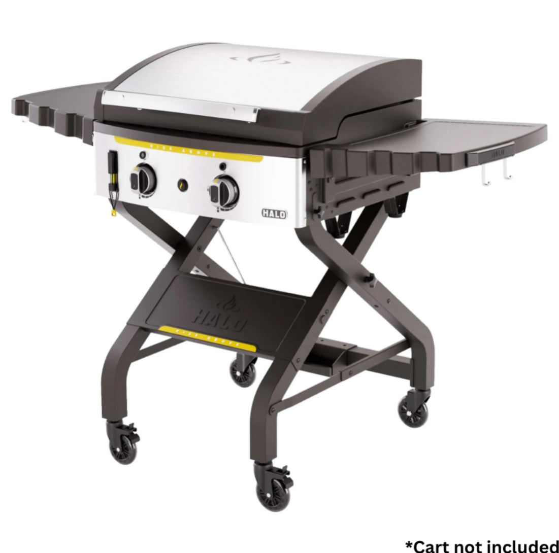 The Halo Elite2B Outdoor Griddle brings versatility, portability, and power to your cooking game. Featuring two burners and four independent cooking zones, this griddle offers precise heat control across 480 sq. in. of cooking space. The inset griddle plate creates a wind-proof design for wall-to-wall heat, while a 10-minute warm-up time and temperature range of 300°F–700°F make it ideal for everything from breakfast to steaks.