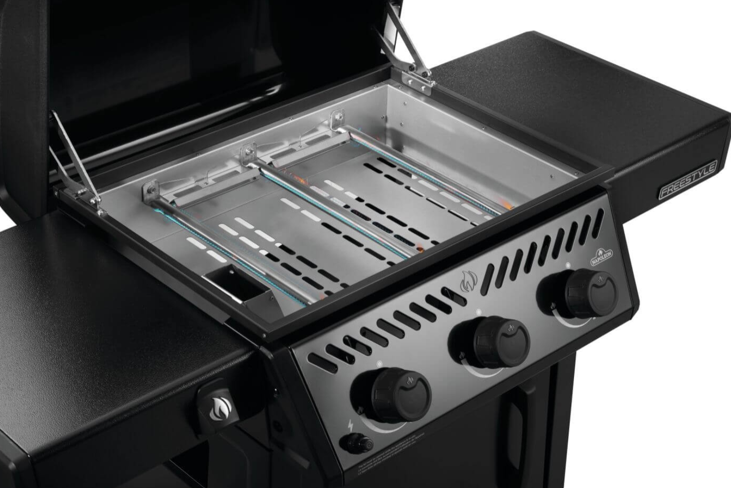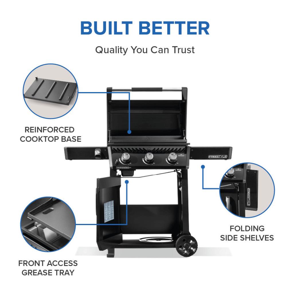 Built for convenient grilling in any space, the folding side shelves with tool hooks and an integrated bottle opener ensure everything you need is close at hand. A dual-pivot LIFT EASE™ lid protects the cooktop when not in use, and the front-access grease tray makes cleanup quick and mess-free. Finished in durable gloss black, the Freestyle Griddle offers compact performance without compromising capability.