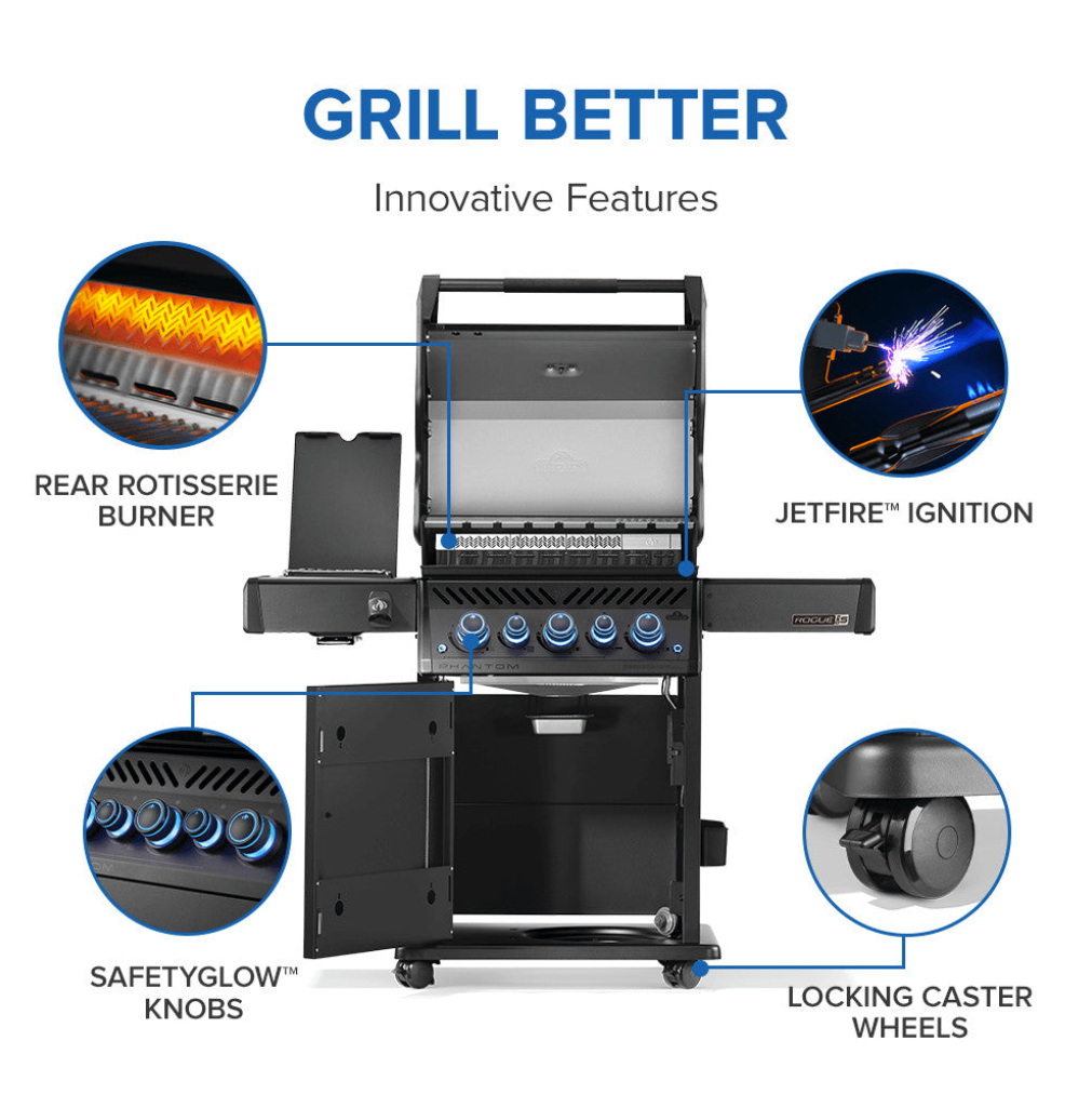 Every element is crafted for both style and function. The rich matte black finish resists wear and adds an elegant edge to any outdoor space. SafetyGlow™ control knobs light up red when burners are active for safer nighttime cooking, and the battery-free ignition system ensures instant, reliable starts. With folding side shelves and smooth-locking casters, this grill offers exceptional performance without sacrificing versatility — the ultimate blend of form and function.