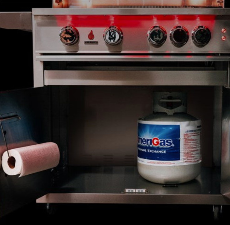 Deluxe Cart Features – Folding side shelves, propane tank storage, magnetic latches, locking castors, interior paper towel holder, and side/rear/bottom ventilation.