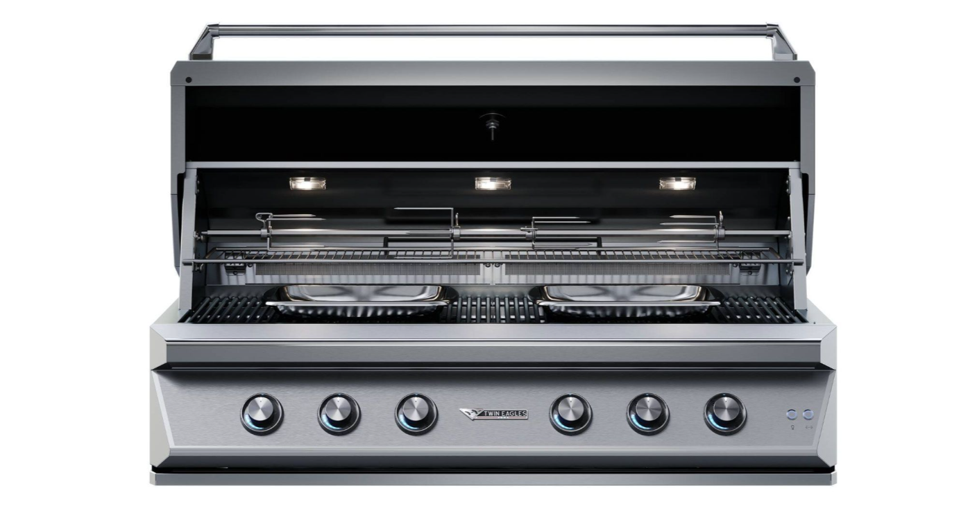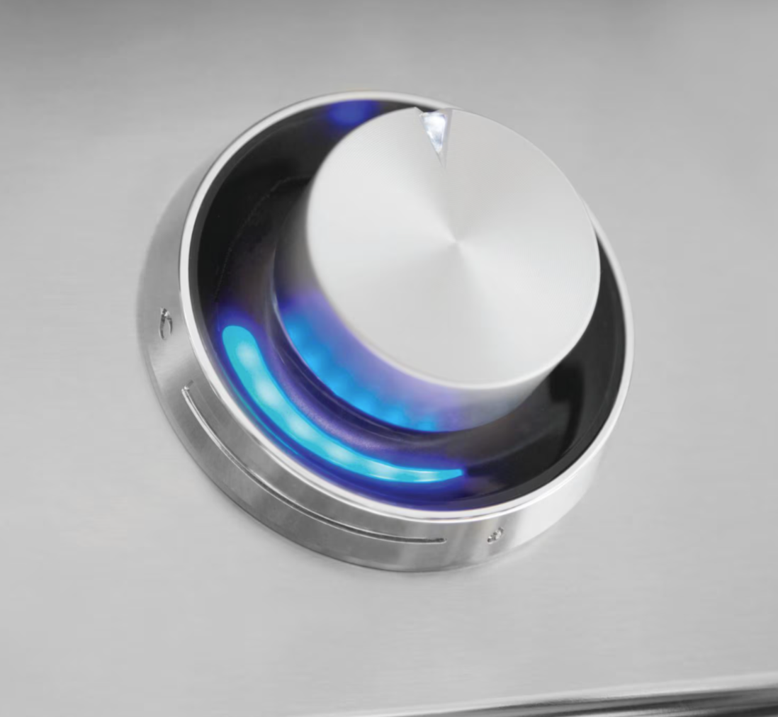 Exclusive Control Illumination with indigo-blue indicators provides clear burner visibility, even in low light. The integrated rotisserie system features dual infrared burners, a concealed motor with chain-driven design, 100 lb capacity, and convenient slide-out storage for the spit rod.