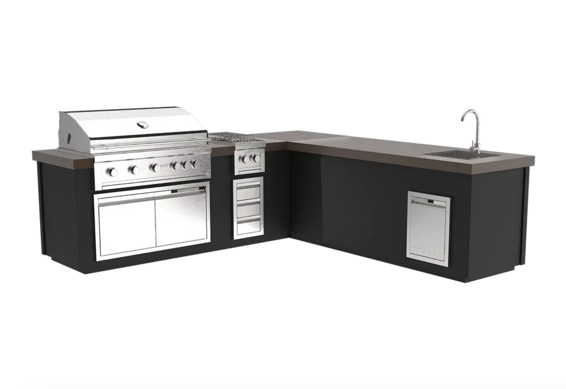 Complete L-shaped outdoor kitchen with grill, storage, sink, side burner, and refrigeration