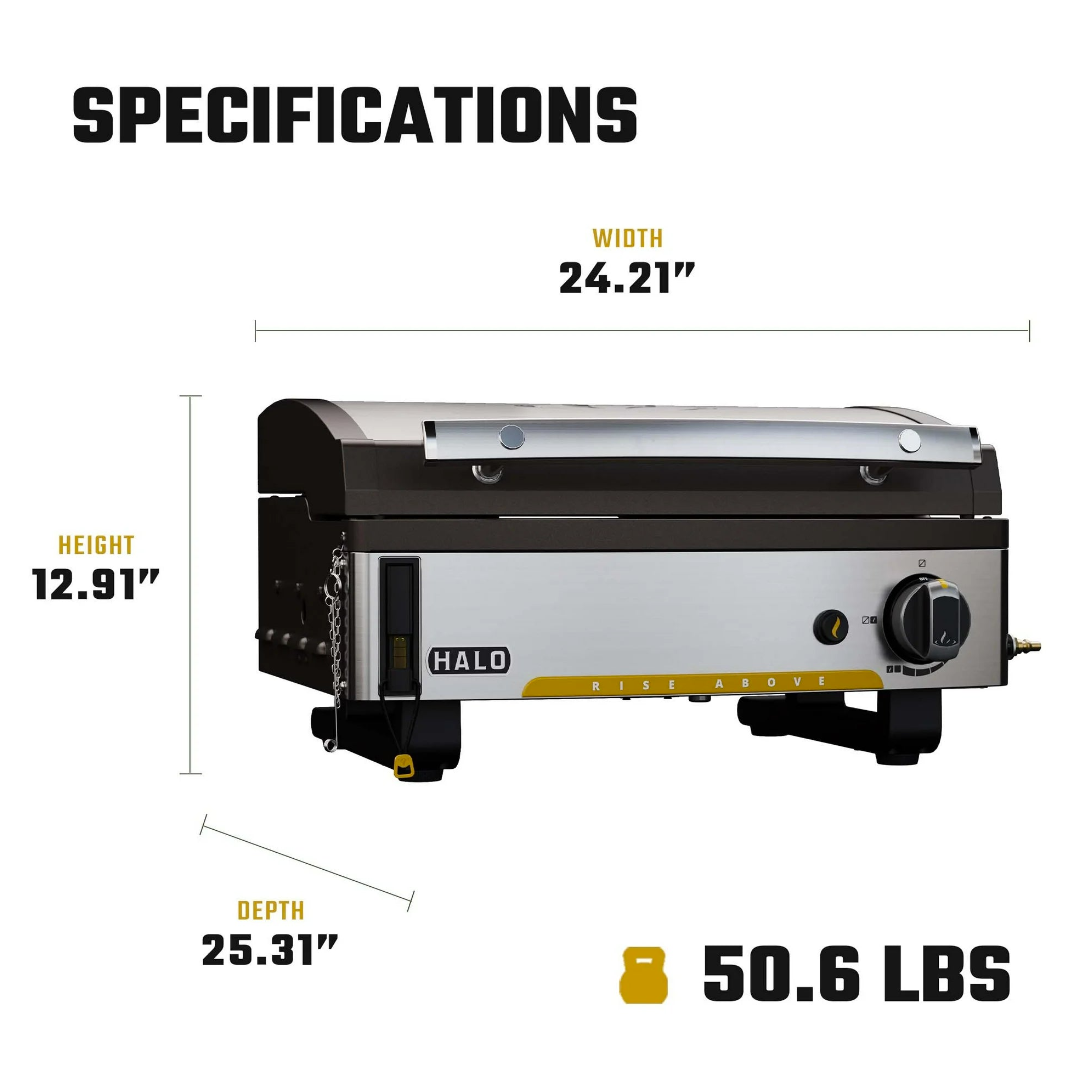 Compact, portable, and powerful the Halo Elite1B Countertop Griddle brings versatility to your outdoor cooking setup. With 1 burner and 2 cooking zones, you get precise temperature control across its 284 sq. in. griddle surface. The patented dual-zone burner system lets you ignite a single zone for lighter meals or both zones for full wall-to-wall cooking. The inset plate design ensures wind-proof performance, while the 10-minute warm-up and 300°F–600°F temperature range make it easy to cook everything from pancakes to burgers.