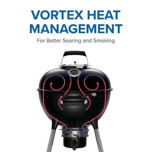 The Premium 18 Charcoal Kettle delivers classic charcoal flavor in a compact, versatile design that’s perfect for smaller patios, balconies, and intimate backyard gatherings. Whether you’re grilling, roasting, or smoking with wood chips, this 18-inch kettle provides reliable performance and excellent heat control. The Vortex heat management system enhances convection for even cooking, improved searing, and better fuel efficiency, while adjustable stainless steel air vents give you precise temperature control in any weather.